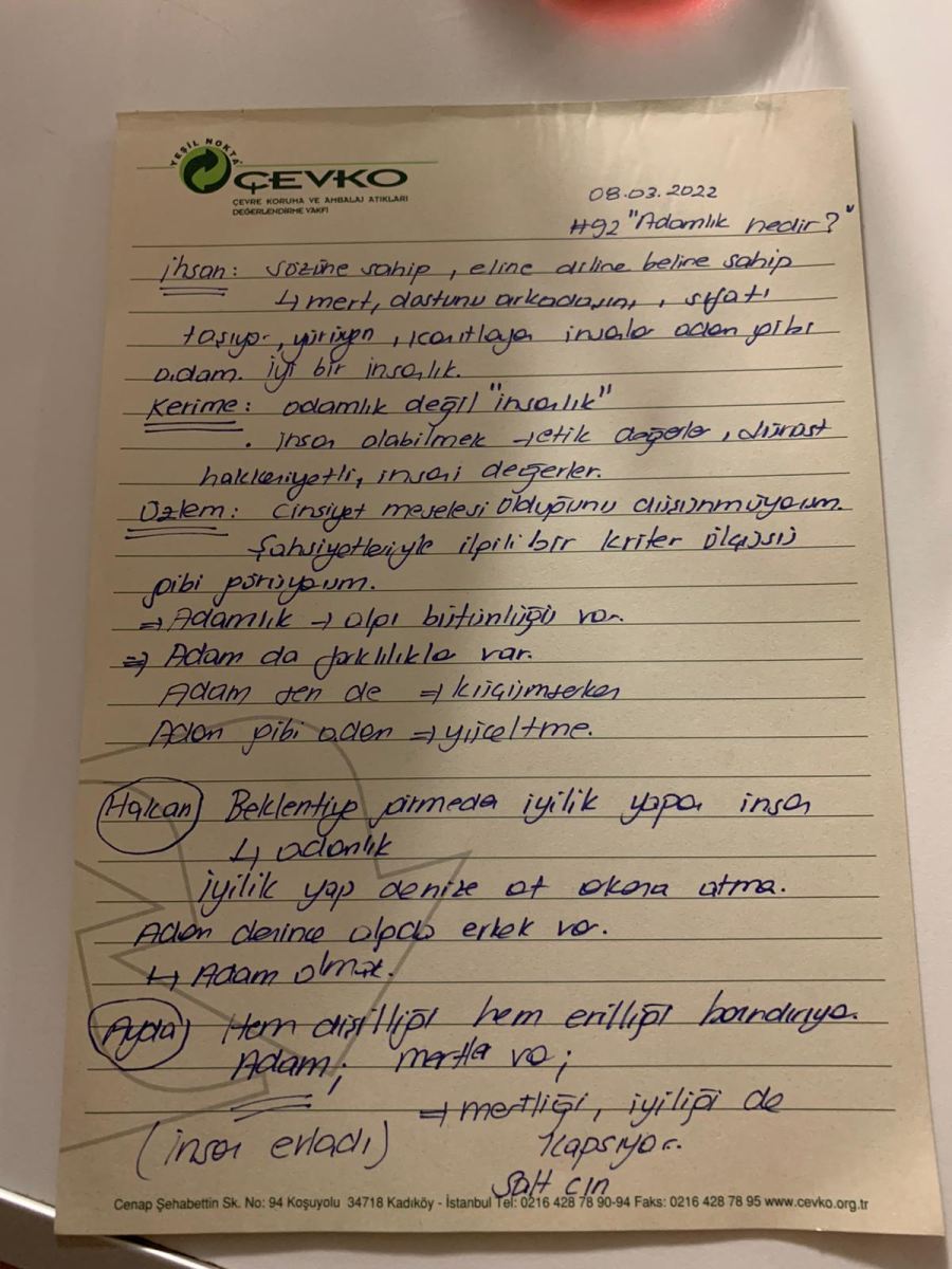 Kerime: Bence, adamlık değil “insanlık” konuşmamız gerekiyor. İnsan olabilmek için çalışmak, etik değerlere saygılı, dürüst hakkaniyetli, insani değerleri yükselten bireyler olmalıyız.