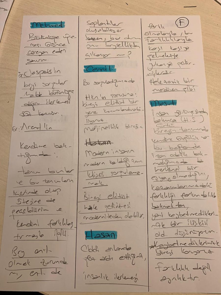 Cemil: Kiper’in sorusuna istinaden; bireyi elitist bir yere konumlandırabiliriz, bireyin marjinalliği söz konusudur. Modern insanın modern kaldığı klişesini sorgulamamız gerekir. Bireyin elitist bir hale gelmesi de moderniteden kaynaklanabilir.