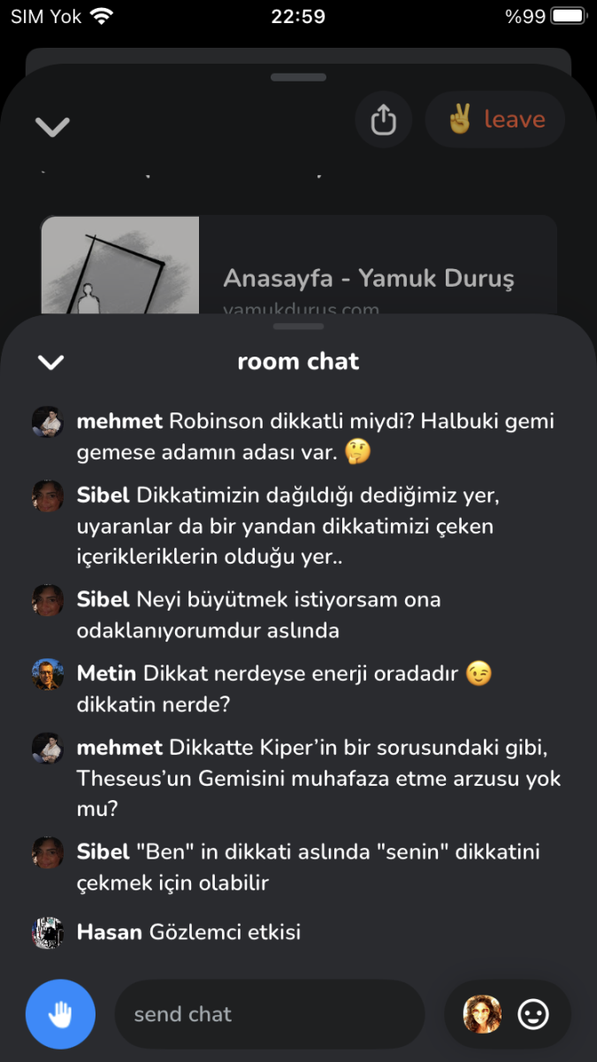 Şu an geldiğimiz noktada o kadar çok uyaranın içerisinde dikkat ettiğiniz ya da dikkatinizi vermek istediğiniz alanda kalıyorsunuz ve orada rahat hissediyorsunuz. Dikkatinizi sizden olmayana vermek dahi istemiyorsunuz. Bu şekilde ayrışıyoruz diyeyim. Bu noktada bu oturumlar bir dikkat kancası olmaktan ziyade bir dikkat tutucuya dönüştüğünden o şekilde değerlendirilebileceğini düşünüyorum.