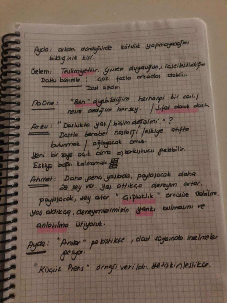 Arzu: Vefadır. Kardeşliğin ötesine geçebilir. Uzaklık ya da mesafe engel değildir. Hata yapabilme hakkı verir. Dost öğretir. Dostluk herhangi bir şeyle yüzleşmeyi kolaylaştırır.