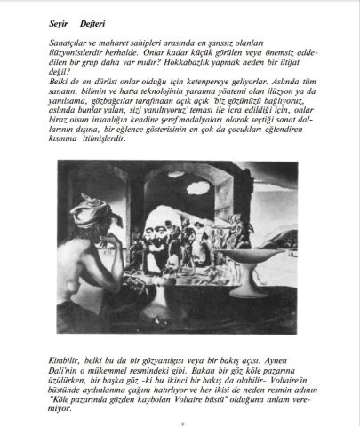Kim bilir, belki bu da bir göz yanılgısı veya bakış açısı. Aynen Dali’nin o mükemmel resmindeki gibi. Bakan bir göz köle pazarına üzülürken, bir başka göz – ki bu ikinci bir bakış da olabilir- Voltaire’in büstünde aydınlanma çağını hatırlıyor ve her ikisi de neden resmin adının “Köle pazarında gözden kaybolan Voltaire büstü” olduğuna anlam veremiyor.