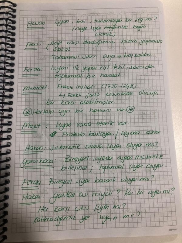 Hasan: İsyan, tahakküm kurmaya çalışan toplum ya da topluluğa karşı gösterdiğimiz direnç veya karşı duruşu isimlendirmek için kullandığımız bir soyut kavram. Maruz kaldığımız ve onaylamadığımız duruma bir karşı çıkış olarak da düşünülebilir.