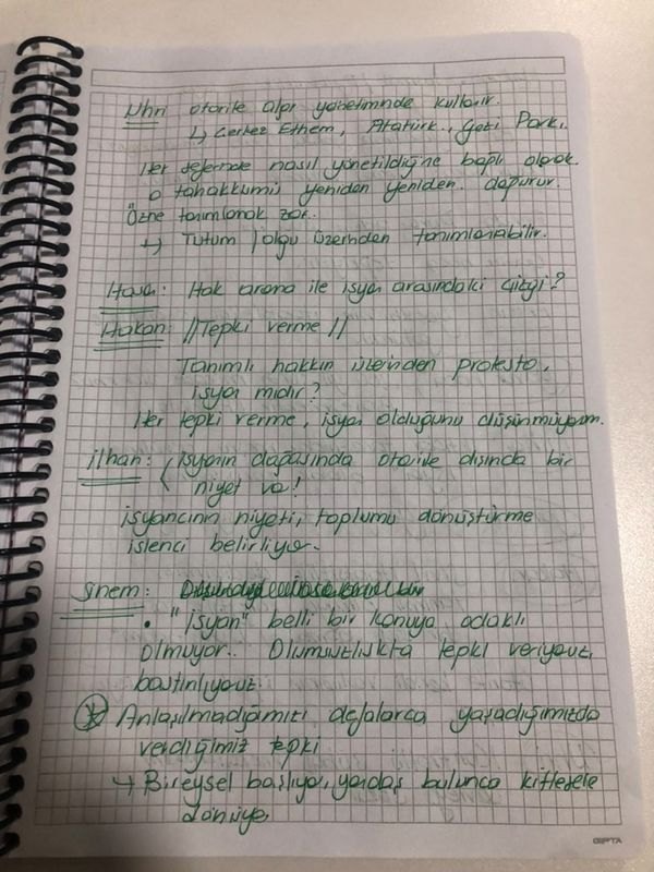 Sinem: İsyan genellikle belli bir konuya odaklı olmuyor. Olumsuzluklara tepki veriyoruz, bastırılıyoruz. Anlaşılmadığımızı defalarca yaşadığımızda verdiğimiz tepki isyan oluyor. Bireysel başlıyor, yandaş bulunca kitlesele dönüyor.
