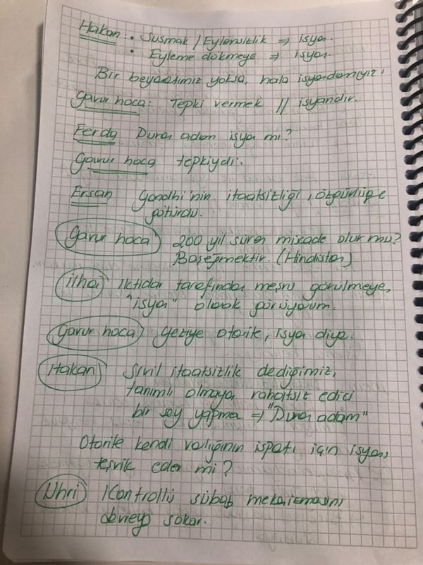 Uhri: Otorite algı yönetimi de kullanılır. Çerkez Ethem, Atatürk, Gezi parkı nereden baktığınıza göre isyan olarak rahatlıkla tanımlanabilir. Otorite, her seferinde nasıl yönetildiğine bağlı olarak o tahakkümü yeniden ve yeniden doğurur. Özne olarak isyanı tanımlamak zor. Tutum ya da olgu üzerinden isyanı daha anlamlı tanımlanabilir.