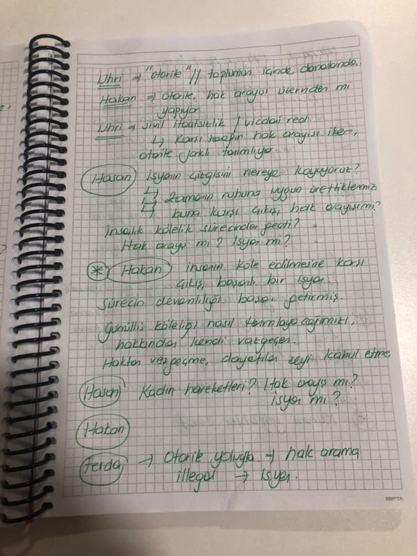 Hasan: Benim kafam hak arayışı ve isyanın çizgisi konusunda berraklaşmadı. İsyanın çizgisini nereye koyuyoruz? Zamanın ruhuna uygun olarak ürettiklerimiz, geleneksele karşı çıktığı için isyan mı olacak? İnsanlık kölelik sürecinden geçti. Kölelik karşıtlığı döneminde hak arayışı mıydı, isyan mıydı? Bugünden bakınca hak arayışı gibi görünüyor ama döneminde acaba aynı şekilde mi algılandı?
