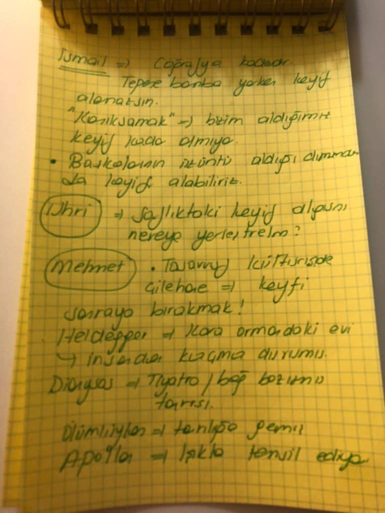 İsmail: Bazı ruhlar acıdan beslenir; keyif ruhun hazza ulaşmasıdır. Coğrafya kederdir; bomba yağarken keyif alınmaz. Ancak bir durumu kanıksamak keyfi engeller; bazen başkalarının üzüntüsünden de keyif alınabilir.