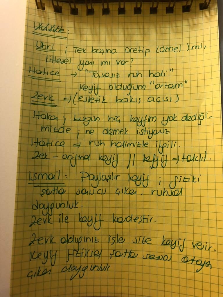 Hatice: Keyif “tasasız bir ruh hali” ve bulunulan ortam ile ilgilidir; zevk ise estetik bir bakış açısıdır.
