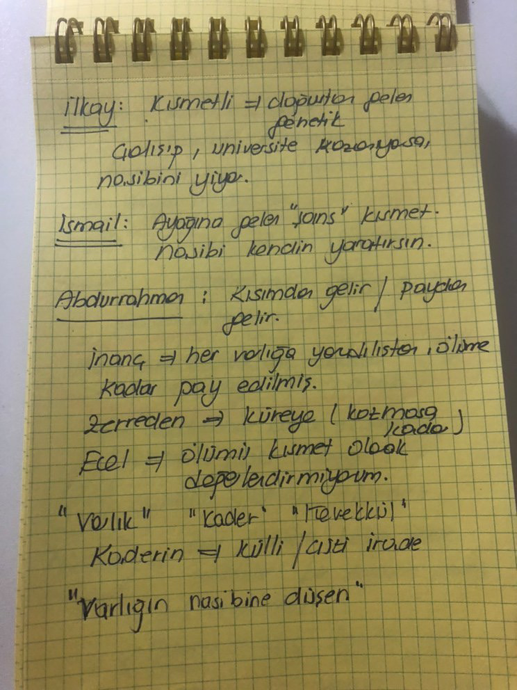 Gamze: Bana göre, bizim kontrol edemediklerimizin özeti, bir “özet kelime”. Galiba daha çok potansiyel eş için kullanılıyor. Ortadoğu topraklarına ait ve kaderci toplumların kavramı gibi geliyor. Yazgı gibi, Tanrının yazdığı gelecek, aksi mümkün değil anlayışı/inanışı ile ilgili bir kavram.