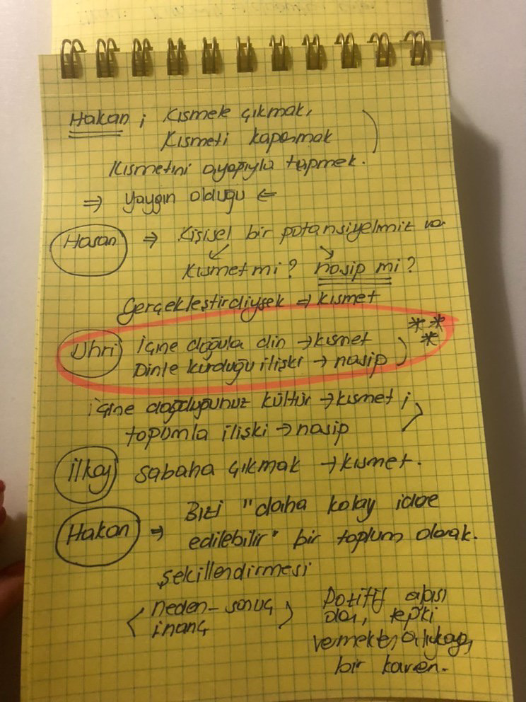 İlkay: Bir de şu taraftan bakalım. Kısmetli diyoruz mesela çocuklara, yeni doğanlara. Doğuştan gelen genetik gibi değer atfediyoruz ama çalışıp, üniversite kazanıyorsa, nasibini yiyor, diyoruz.