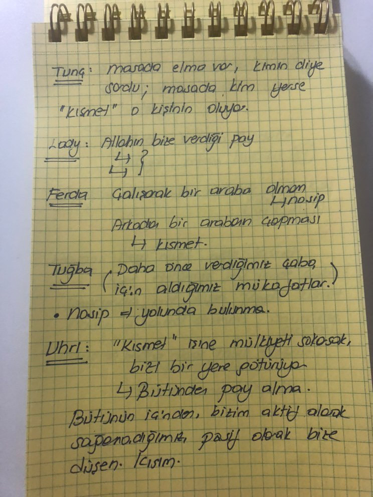 Gamze: Bana göre, bizim kontrol edemediklerimizin özeti, bir “özet kelime”. Galiba daha çok potansiyel eş için kullanılıyor. Ortadoğu topraklarına ait ve kaderci toplumların kavramı gibi geliyor. Yazgı gibi, Tanrının yazdığı gelecek, aksi mümkün değil anlayışı/inanışı ile ilgili bir kavram.