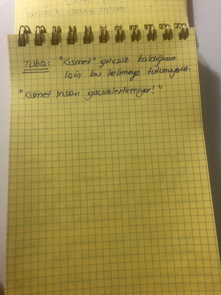 Tuba: Kısmet… Güçsüz kaldığımız için bu kelimeye tutunuyoruz. “Kısmet insanı güçsüzleştirmiyor!”
