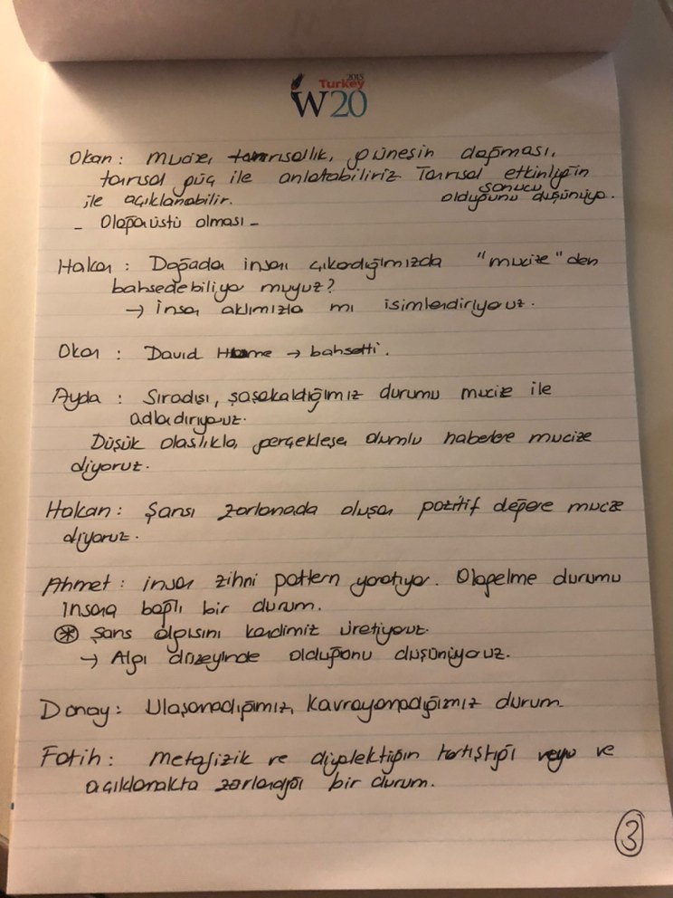 Büşra: (Soru: Nedir) Mucize, var olan hayatımızda kendi farkındalığımız dışında gerçekleşen duygu durumu. (Soru: Bir şeyin ilk defa olması mı mucize yoksa defalarca tekrar olması mı mucizedir?) İlk kez olan bir şey olağandışıdır. Defalarca olan bir şeyse olağandır, sıradandır.