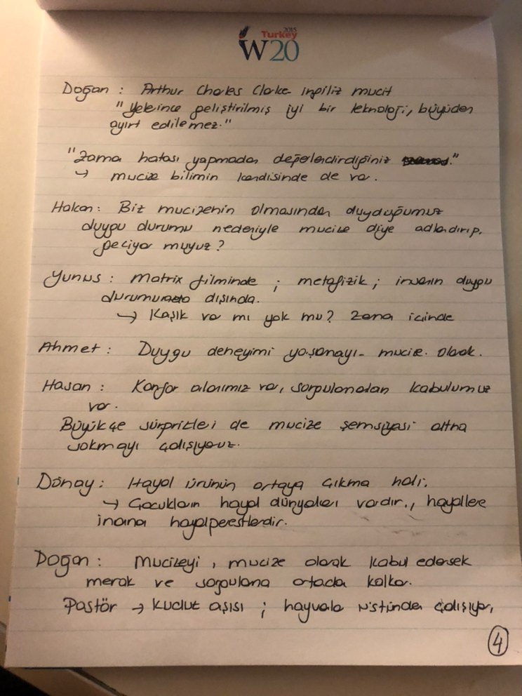 Ahmet: İnsanı aciz bırakan, dinlerde olağanüstü olarak tanımlanan şeydir. Bilge-ce bakmaya çalıştığımızda olağan şeyler. Miraç, idrakin yükselişi, algımızın yükselişi, insanın potansiyelini gerçekleştirmesi de miraçtır.