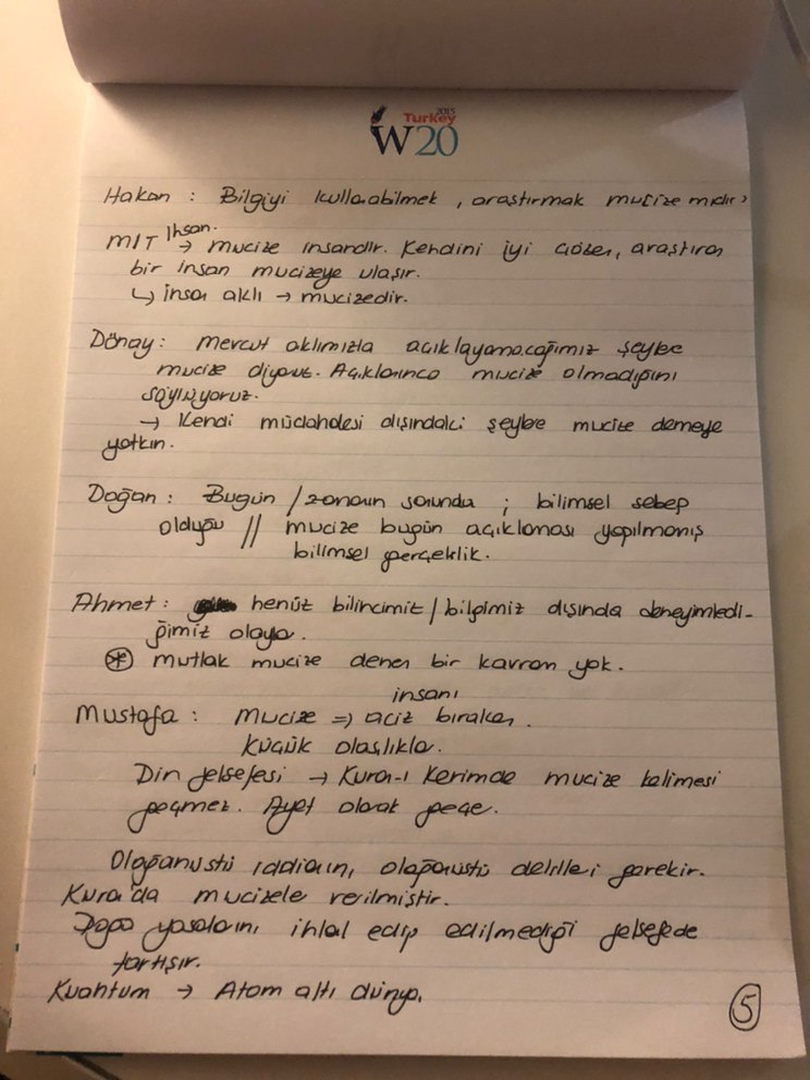 Büşra: (Soru: Nedir) Mucize, var olan hayatımızda kendi farkındalığımız dışında gerçekleşen duygu durumu. (Soru: Bir şeyin ilk defa olması mı mucize yoksa defalarca tekrar olması mı mucizedir?) İlk kez olan bir şey olağandışıdır. Defalarca olan bir şeyse olağandır, sıradandır.