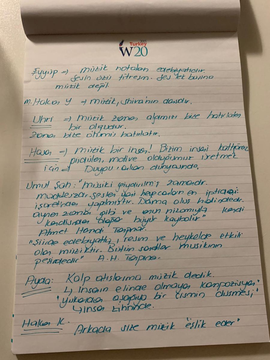 Soru: Bu akşam hayatımızın olmazsa olmaz bir parçası olan müziğin ne olduğunu konuşacağız. Birçoğunuz için bu kavram muhtemelen ilk bakışta somut görünecek ama üstüne yüklediğimiz o kadar çok anlam var ki… Müzik nedir, sizin için müzik nedir?”