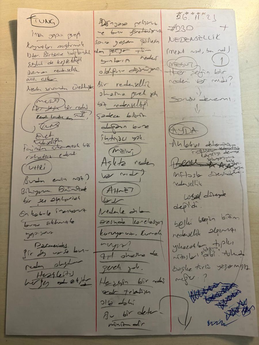 Ahmet: Nedeni vardır bence çünkü Uhri’den benim ayrıştığım nokta o olacak çünkü biz nedenle -ben yanlış biliyor da olabilirim bu arada- anlam arasında korelasyon kuruyoruz gibi geliyor bana, kurmalı mıyız? Var mıdır, varsa nedir? Bunu anlamak lazım bence çünkü tesadüfle nedensellik karşı karşıya, zıt kavramlar gibi konuşuluyor. Öyle olması gerekmiyor bence.