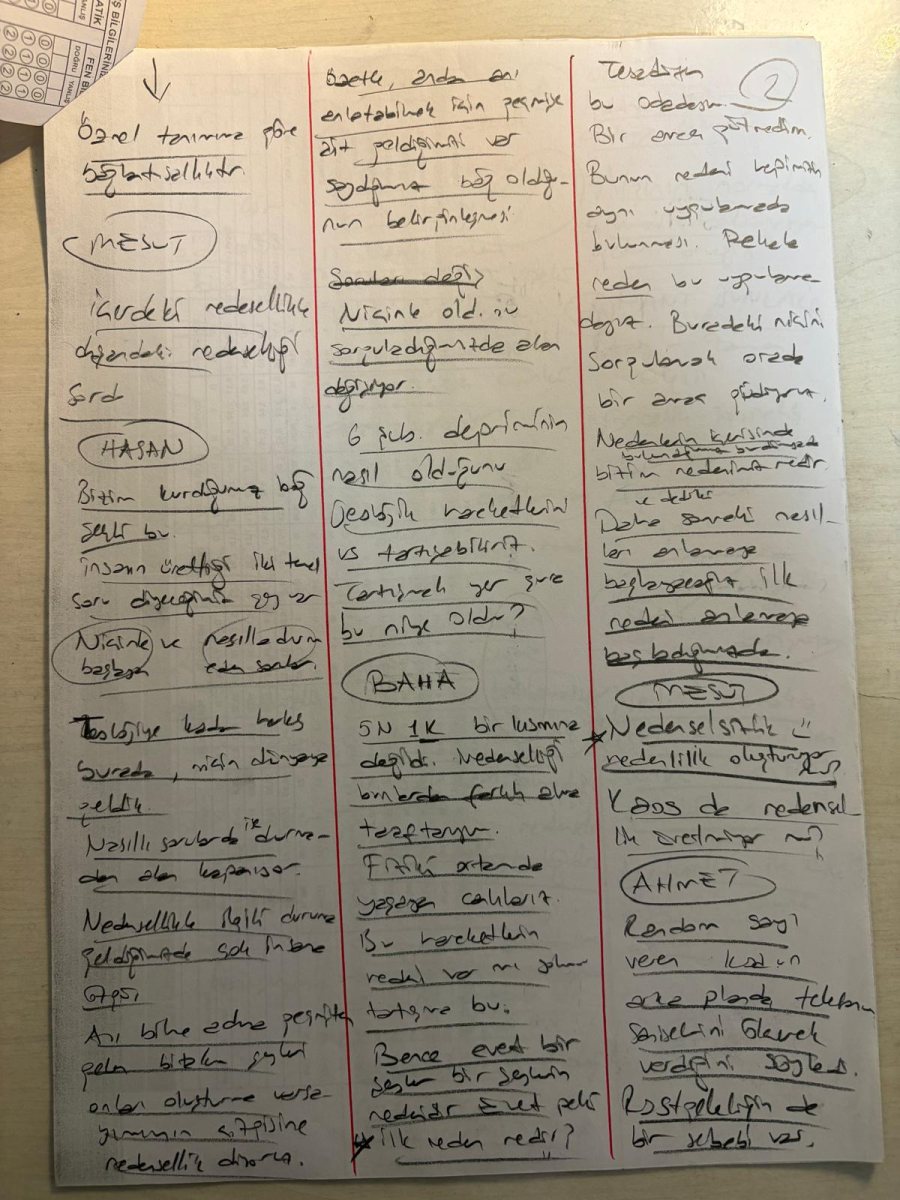 Mesut: Şimdi bu bağlamda nedenselsizlik bir nedensellik oluşturuyor mu? Her şeyin tamam onların kendi içlerinde nedenleri var. Tamam açıkladık ama sanki o zaman bu bizim düzensiz dediğimiz bizim açımızdan bu karmaşa bu kaosta aslında bir nedensellik oluşturuyor kendi içinde değil mi?