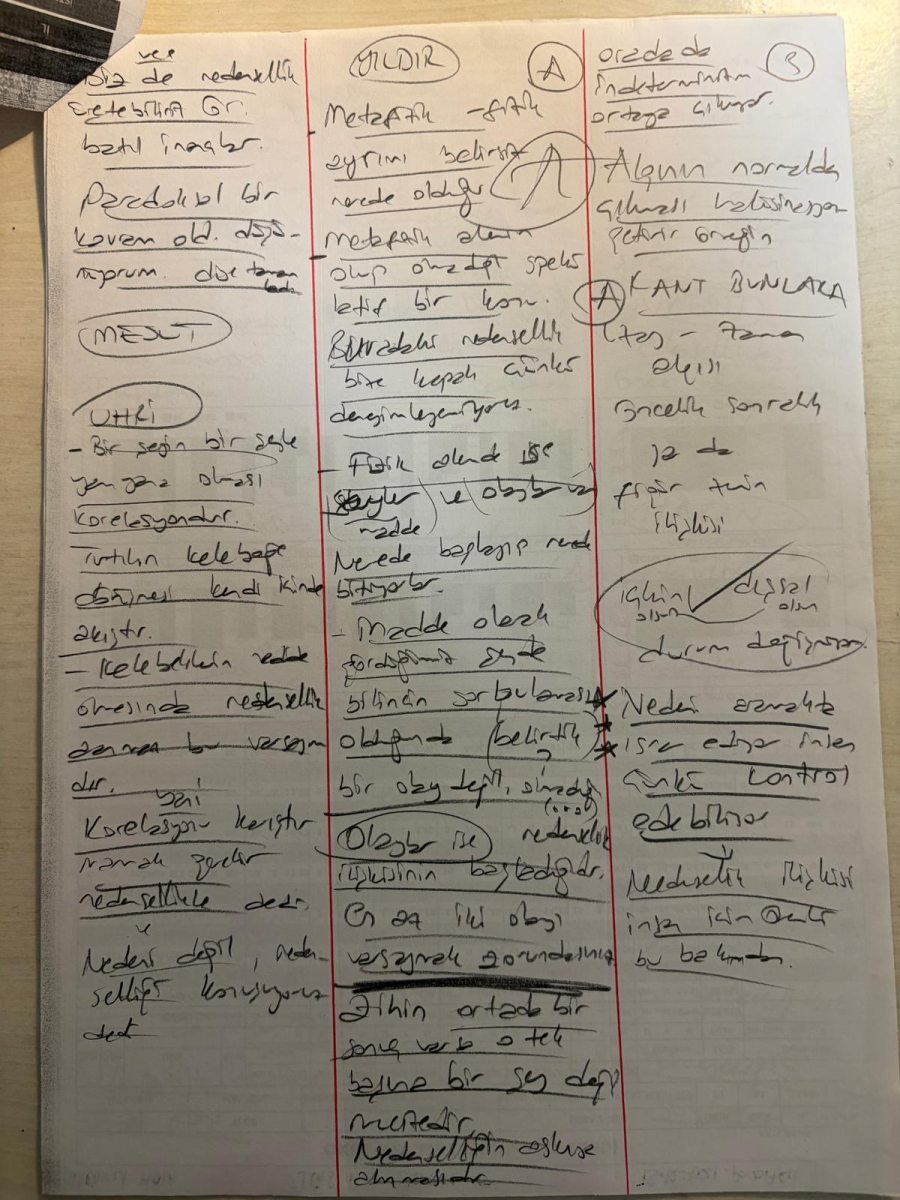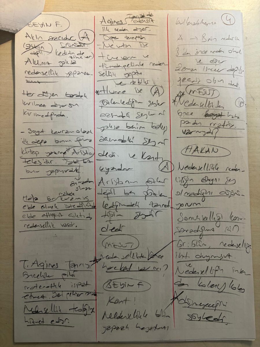 Mesut: Biraz iç ve dışı böyle nedensellik nasıllılık girdin sonra niçinlilikten devam ettin. Böyle bizden çıkıp böyle dağılan bir şey sanki. Karşı tarafa bir tane çarpmıyor birkaç tane çarpıyor ve geliyor. Ayda nedensellik düşünceyle mi var? Nedenselliği biz sadece düşünceyle mi koyabiliyoruz masaya? Mesela ne bileyim hayvanlarda nedensellik var mı? Varsa o nedensellik nasıl bir nedensellik?