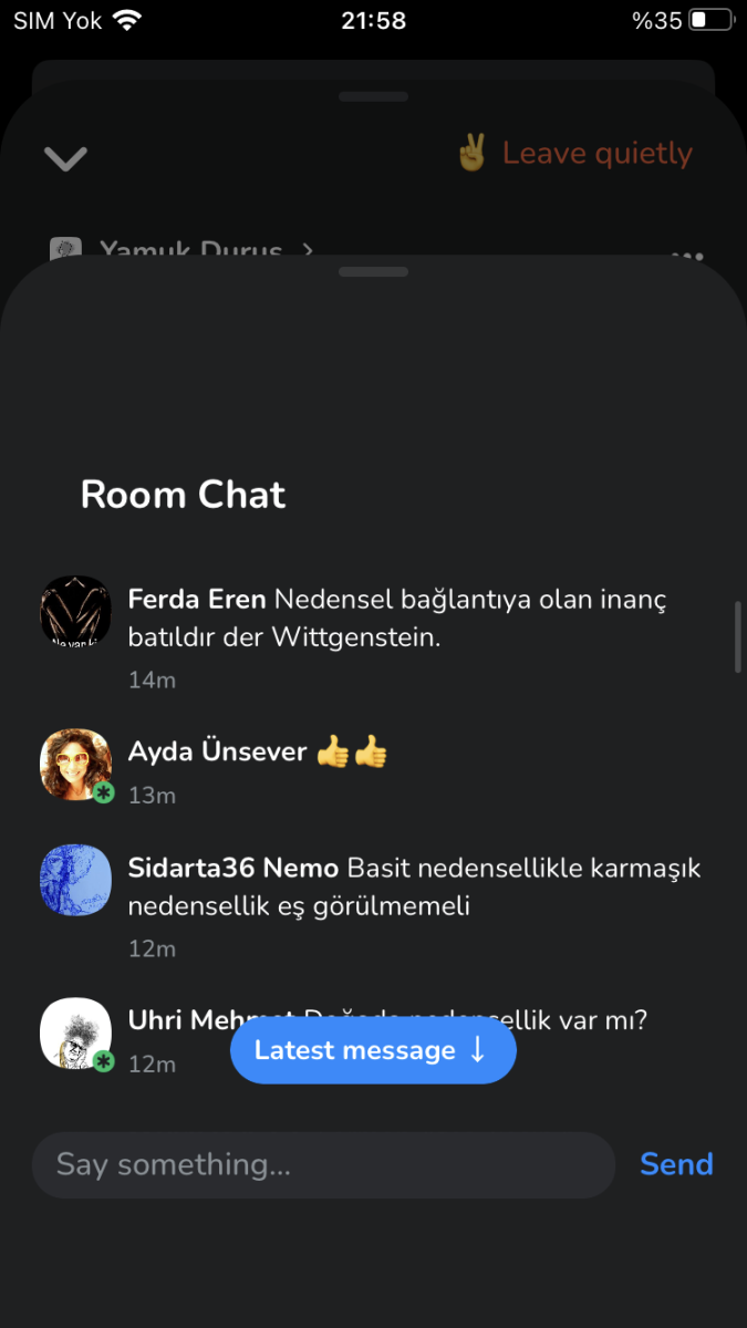 Bir arkadaşınız öyle söyledi ben gerçekten tesadüfen bu odadayım. Ama bir önceki karede işte uygulamayı indirmiştim sizler bunu indirmiştiniz. Sizler burada sohbet ederken ben tesadüfen sohbetin ortasına denk geldim. Burada bir amaç var mı benim daha önceden gütmüş olduğum bir amaç yok. Sizlerle tanışmak gibi bir amacım yoktu. Tanıştık çok hoş oldu bir süredir de dinliyorum ve keyif alıyorum iyi oldu ama böyle bir amacım var mıydı, hayır yoktu. Sizin benimle tanışmak gibi bir amacınız var mıydı bu da yoktu ama ne oldu tesadüfen böyle bir sohbet cereyan etmeye başladı. Bunun nedeni hepimizin aynı uygulamada bulunmamız ya da aynı evrende bulunmamız çok da fark etmiyor. Peki neden biz bu uygulamadayız? Birileri yapmış. Neden bu evrendeyiz? Bir şekilde meydana gelmiş. Buradaki niçini sorgulamaya başlamak daha önce de söylendiği gibi olayın çok daha farklı bir felsefi boyutu çünkü orada bir amaç güdüyoruz. Fakat neden işte eski dilde ne diyorduk biz buna sebep diyorduk. Nedenlerse sebepleri arıyor.