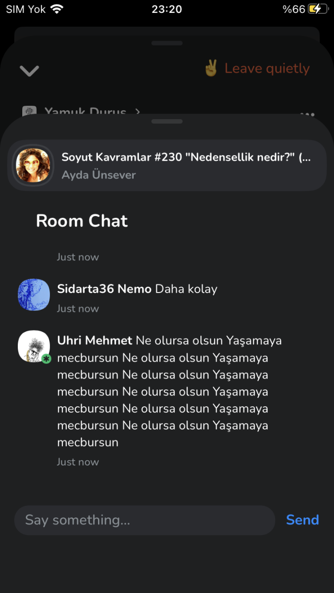 Bir arkadaşınız öyle söyledi ben gerçekten tesadüfen bu odadayım. Ama bir önceki karede işte uygulamayı indirmiştim sizler bunu indirmiştiniz. Sizler burada sohbet ederken ben tesadüfen sohbetin ortasına denk geldim. Burada bir amaç var mı benim daha önceden gütmüş olduğum bir amaç yok. Sizlerle tanışmak gibi bir amacım yoktu. Tanıştık çok hoş oldu bir süredir de dinliyorum ve keyif alıyorum iyi oldu ama böyle bir amacım var mıydı, hayır yoktu. Sizin benimle tanışmak gibi bir amacınız var mıydı bu da yoktu ama ne oldu tesadüfen böyle bir sohbet cereyan etmeye başladı. Bunun nedeni hepimizin aynı uygulamada bulunmamız ya da aynı evrende bulunmamız çok da fark etmiyor. Peki neden biz bu uygulamadayız? Birileri yapmış. Neden bu evrendeyiz? Bir şekilde meydana gelmiş. Buradaki niçini sorgulamaya başlamak daha önce de söylendiği gibi olayın çok daha farklı bir felsefi boyutu çünkü orada bir amaç güdüyoruz. Fakat neden işte eski dilde ne diyorduk biz buna sebep diyorduk. Nedenlerse sebepleri arıyor.