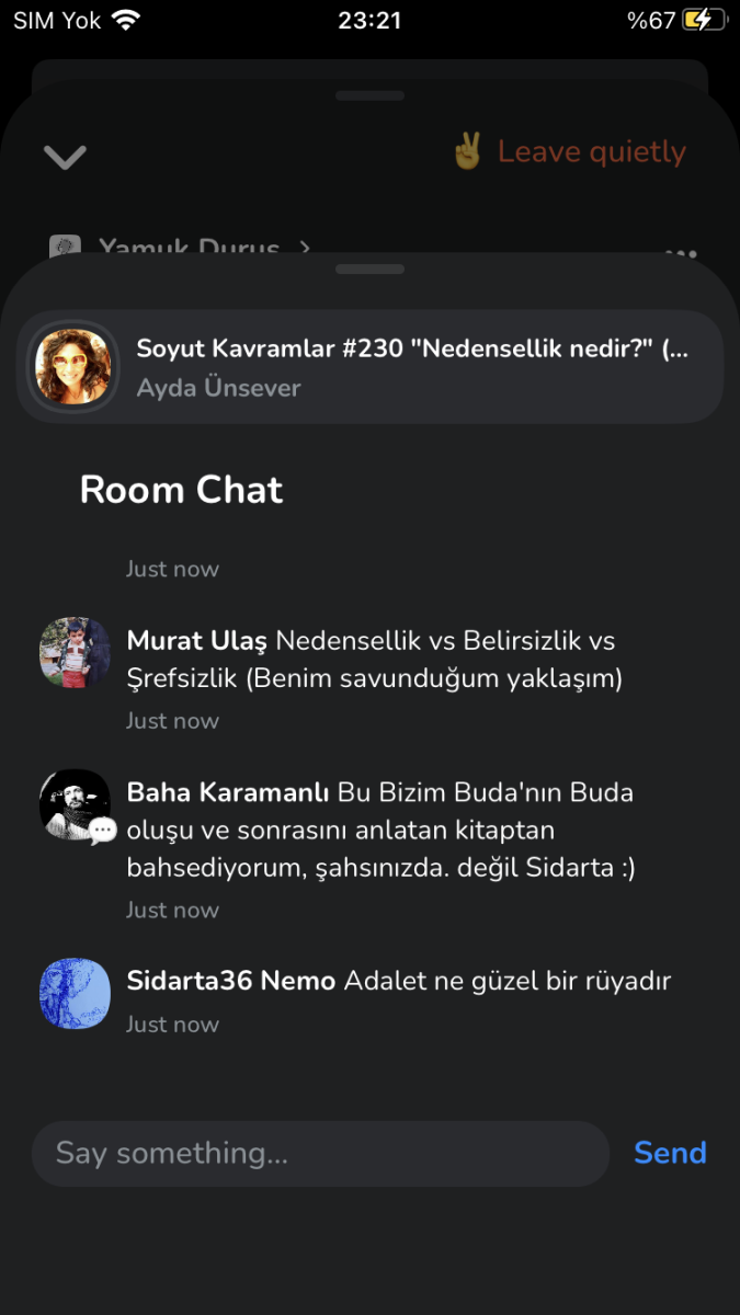 Bir arkadaşınız öyle söyledi ben gerçekten tesadüfen bu odadayım. Ama bir önceki karede işte uygulamayı indirmiştim sizler bunu indirmiştiniz. Sizler burada sohbet ederken ben tesadüfen sohbetin ortasına denk geldim. Burada bir amaç var mı benim daha önceden gütmüş olduğum bir amaç yok. Sizlerle tanışmak gibi bir amacım yoktu. Tanıştık çok hoş oldu bir süredir de dinliyorum ve keyif alıyorum iyi oldu ama böyle bir amacım var mıydı, hayır yoktu. Sizin benimle tanışmak gibi bir amacınız var mıydı bu da yoktu ama ne oldu tesadüfen böyle bir sohbet cereyan etmeye başladı. Bunun nedeni hepimizin aynı uygulamada bulunmamız ya da aynı evrende bulunmamız çok da fark etmiyor. Peki neden biz bu uygulamadayız? Birileri yapmış. Neden bu evrendeyiz? Bir şekilde meydana gelmiş. Buradaki niçini sorgulamaya başlamak daha önce de söylendiği gibi olayın çok daha farklı bir felsefi boyutu çünkü orada bir amaç güdüyoruz. Fakat neden işte eski dilde ne diyorduk biz buna sebep diyorduk. Nedenlerse sebepleri arıyor.