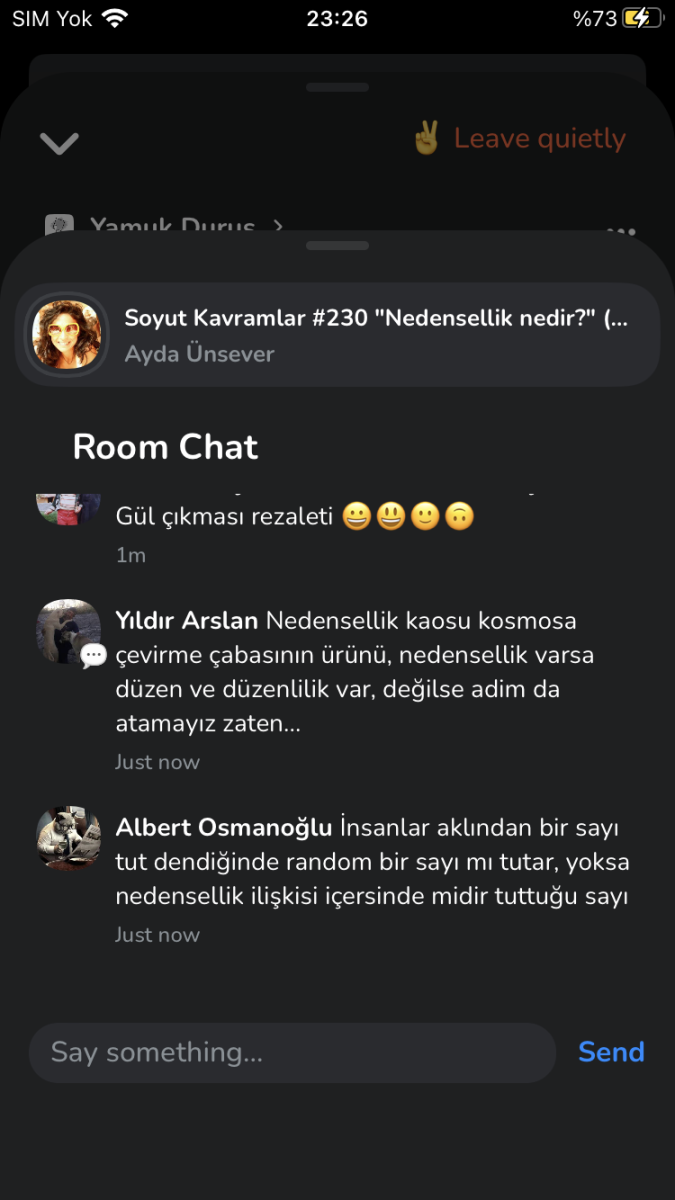 Bir arkadaşınız öyle söyledi ben gerçekten tesadüfen bu odadayım. Ama bir önceki karede işte uygulamayı indirmiştim sizler bunu indirmiştiniz. Sizler burada sohbet ederken ben tesadüfen sohbetin ortasına denk geldim. Burada bir amaç var mı benim daha önceden gütmüş olduğum bir amaç yok. Sizlerle tanışmak gibi bir amacım yoktu. Tanıştık çok hoş oldu bir süredir de dinliyorum ve keyif alıyorum iyi oldu ama böyle bir amacım var mıydı, hayır yoktu. Sizin benimle tanışmak gibi bir amacınız var mıydı bu da yoktu ama ne oldu tesadüfen böyle bir sohbet cereyan etmeye başladı. Bunun nedeni hepimizin aynı uygulamada bulunmamız ya da aynı evrende bulunmamız çok da fark etmiyor. Peki neden biz bu uygulamadayız? Birileri yapmış. Neden bu evrendeyiz? Bir şekilde meydana gelmiş. Buradaki niçini sorgulamaya başlamak daha önce de söylendiği gibi olayın çok daha farklı bir felsefi boyutu çünkü orada bir amaç güdüyoruz. Fakat neden işte eski dilde ne diyorduk biz buna sebep diyorduk. Nedenlerse sebepleri arıyor.