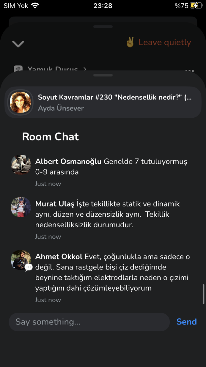Bir arkadaşınız öyle söyledi ben gerçekten tesadüfen bu odadayım. Ama bir önceki karede işte uygulamayı indirmiştim sizler bunu indirmiştiniz. Sizler burada sohbet ederken ben tesadüfen sohbetin ortasına denk geldim. Burada bir amaç var mı benim daha önceden gütmüş olduğum bir amaç yok. Sizlerle tanışmak gibi bir amacım yoktu. Tanıştık çok hoş oldu bir süredir de dinliyorum ve keyif alıyorum iyi oldu ama böyle bir amacım var mıydı, hayır yoktu. Sizin benimle tanışmak gibi bir amacınız var mıydı bu da yoktu ama ne oldu tesadüfen böyle bir sohbet cereyan etmeye başladı. Bunun nedeni hepimizin aynı uygulamada bulunmamız ya da aynı evrende bulunmamız çok da fark etmiyor. Peki neden biz bu uygulamadayız? Birileri yapmış. Neden bu evrendeyiz? Bir şekilde meydana gelmiş. Buradaki niçini sorgulamaya başlamak daha önce de söylendiği gibi olayın çok daha farklı bir felsefi boyutu çünkü orada bir amaç güdüyoruz. Fakat neden işte eski dilde ne diyorduk biz buna sebep diyorduk. Nedenlerse sebepleri arıyor.
