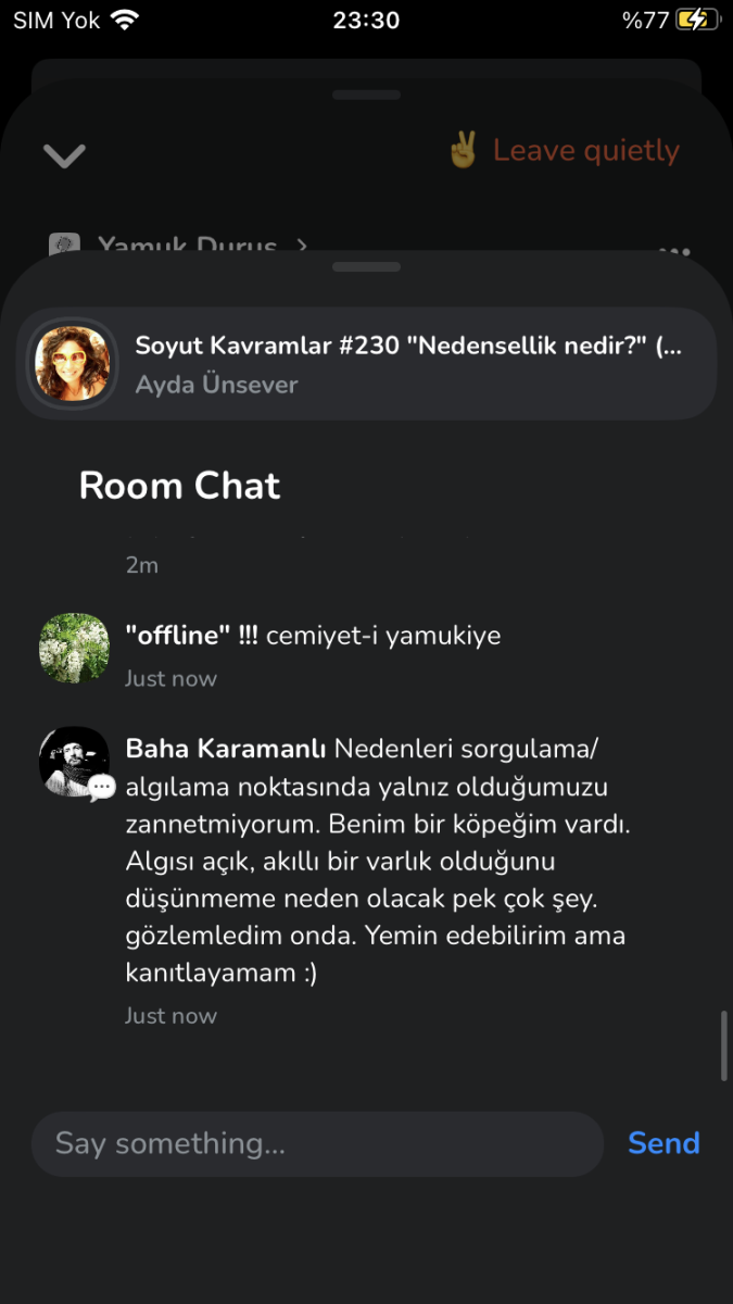 Bir arkadaşınız öyle söyledi ben gerçekten tesadüfen bu odadayım. Ama bir önceki karede işte uygulamayı indirmiştim sizler bunu indirmiştiniz. Sizler burada sohbet ederken ben tesadüfen sohbetin ortasına denk geldim. Burada bir amaç var mı benim daha önceden gütmüş olduğum bir amaç yok. Sizlerle tanışmak gibi bir amacım yoktu. Tanıştık çok hoş oldu bir süredir de dinliyorum ve keyif alıyorum iyi oldu ama böyle bir amacım var mıydı, hayır yoktu. Sizin benimle tanışmak gibi bir amacınız var mıydı bu da yoktu ama ne oldu tesadüfen böyle bir sohbet cereyan etmeye başladı. Bunun nedeni hepimizin aynı uygulamada bulunmamız ya da aynı evrende bulunmamız çok da fark etmiyor. Peki neden biz bu uygulamadayız? Birileri yapmış. Neden bu evrendeyiz? Bir şekilde meydana gelmiş. Buradaki niçini sorgulamaya başlamak daha önce de söylendiği gibi olayın çok daha farklı bir felsefi boyutu çünkü orada bir amaç güdüyoruz. Fakat neden işte eski dilde ne diyorduk biz buna sebep diyorduk. Nedenlerse sebepleri arıyor.