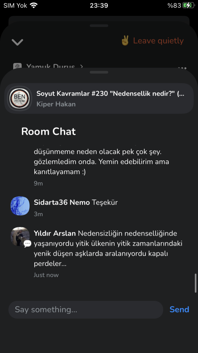 Bir arkadaşınız öyle söyledi ben gerçekten tesadüfen bu odadayım. Ama bir önceki karede işte uygulamayı indirmiştim sizler bunu indirmiştiniz. Sizler burada sohbet ederken ben tesadüfen sohbetin ortasına denk geldim. Burada bir amaç var mı benim daha önceden gütmüş olduğum bir amaç yok. Sizlerle tanışmak gibi bir amacım yoktu. Tanıştık çok hoş oldu bir süredir de dinliyorum ve keyif alıyorum iyi oldu ama böyle bir amacım var mıydı, hayır yoktu. Sizin benimle tanışmak gibi bir amacınız var mıydı bu da yoktu ama ne oldu tesadüfen böyle bir sohbet cereyan etmeye başladı. Bunun nedeni hepimizin aynı uygulamada bulunmamız ya da aynı evrende bulunmamız çok da fark etmiyor. Peki neden biz bu uygulamadayız? Birileri yapmış. Neden bu evrendeyiz? Bir şekilde meydana gelmiş. Buradaki niçini sorgulamaya başlamak daha önce de söylendiği gibi olayın çok daha farklı bir felsefi boyutu çünkü orada bir amaç güdüyoruz. Fakat neden işte eski dilde ne diyorduk biz buna sebep diyorduk. Nedenlerse sebepleri arıyor.
