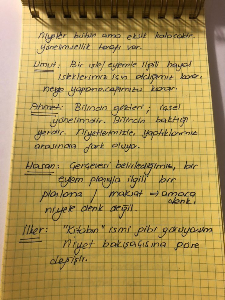 Ahmet: Bana göre niyet, genel ifadeler içeren bir “duygu durumu”.