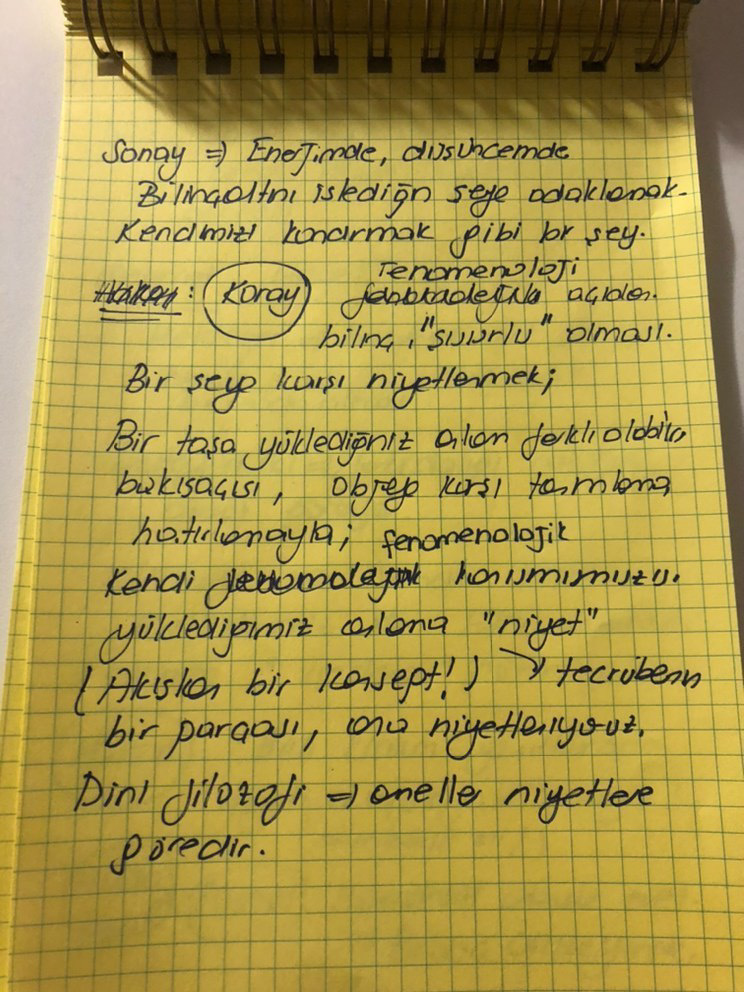 Koray: Fenomenoloji açısından, bilinç “şuurlu” olmalı. Bir şeye karşı niyetlenmek; Bir taşa yüklediğiniz anlam farklı olabilir. Bakış açısı, objeye karşı tanımlama hatırlamayla, fenomenolojik kendi konuşmamıza yüklediğimiz anlama “niyet” (tecrübenin) akışkan bir konsept! Bir parçası, ona niyetleniyoruz. Teolojik açıdan ameller, niyetlere göredir.