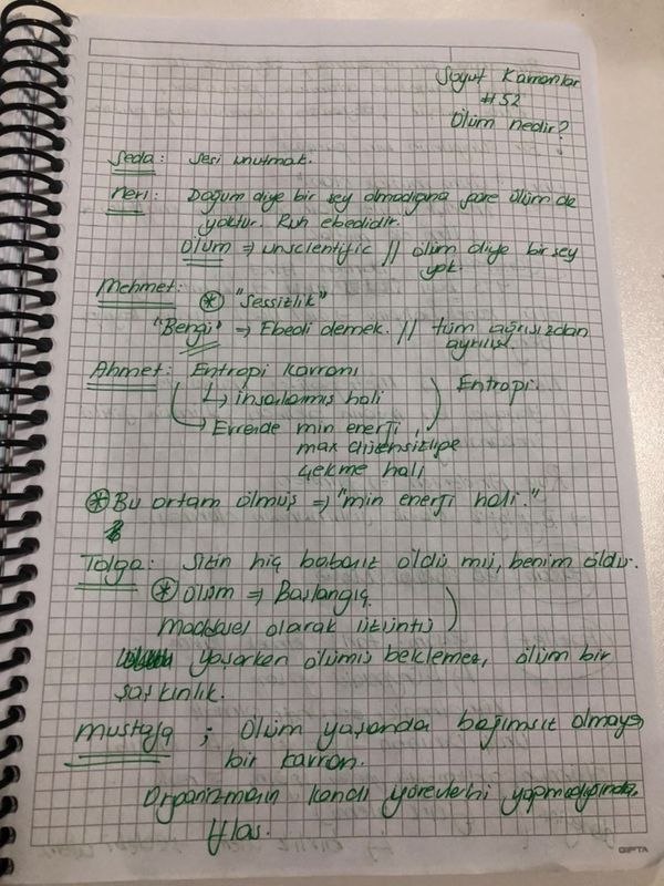 Ahmet: Ölüm deyince, benim aklıma ilk önce Entropi kavramı geliyor. Entropi bildiğiniz gibi sıfır olma eğilimindedir, ölüm de insan için Entropi halidir. En düşük enerjiyle en yüksek düzensizliği sürdürdüğümüz haldir.