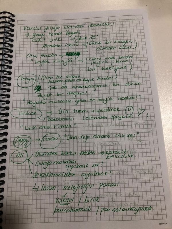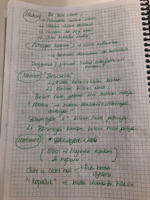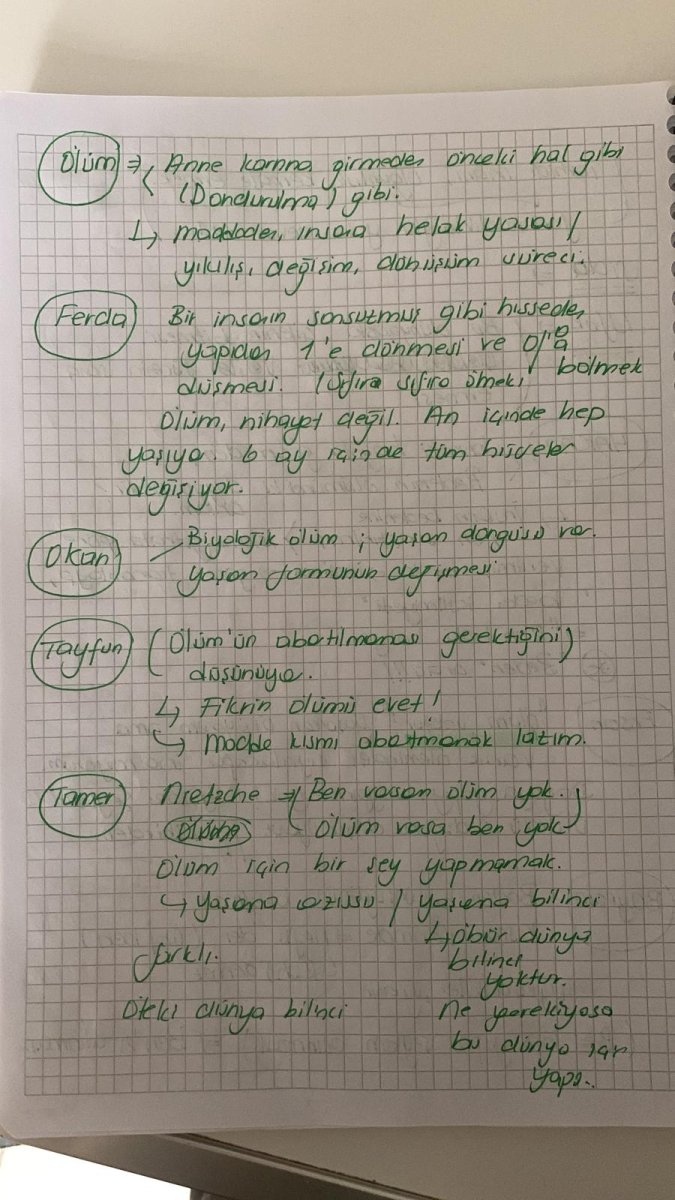 Mehmet: Ölümü hayatın toplamı olarak ya da Z raporu olarak görebiliriz. Ölüm bedenin ceset halidir. Ruh ve bedenin birbirinden ayrılmasıdır. Bu ayrışma ya da “kopukluk” diğer insanlarda hüzne neden olur. Varoluş felsefesi de ölüm üzerinden dönmüştür. Yahya Kemal Beyatlı, Cahit Sıtkı Tarancı ya da daha önce bahsedildiği gibi Oruç Aruoba ölümü dert edinmiş şairlerimizdir.