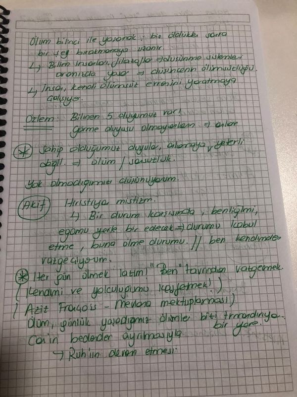 Fazilet: Ölümü tarif edebilmem için galiba yaşamı tarif edebilmem lazım. Dünyadaki yaşam var olmak, görünür olmak gibi görünüyor. Ölüm, yok olmak, görünmez olmak mıdır? Ölüm deyince benim de aklıma Oruç Aruoba’nın ‘De ki işte’ kitabı geliyor. Ölümün prizmaya gelen ışığın, 7 renge ayrışması gibi… Deneyim (fark âlemi) birlik âlemi–edebi âlem. Tevhit inancı, olgunluk, kemale ermek demektir. Farkındalıklarınla yola devam et!