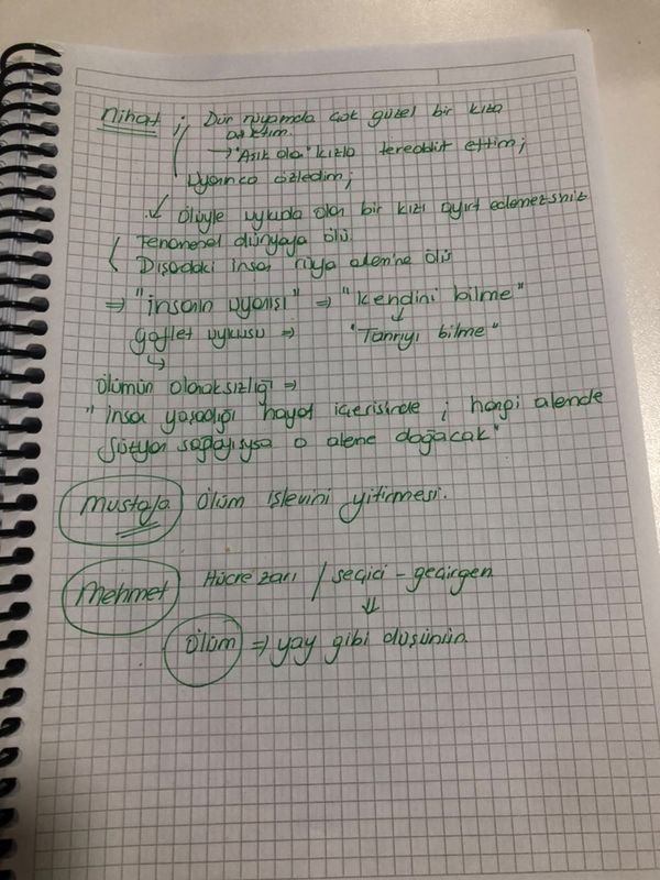 Nihat: Dün rüyamda bir kız gördüm. Uyandığımda yoktu. Bu kızın ölmüş olmasıyla bir rüya olması arasında fenomenolojik açıdan bir fark yok. Dışarıdaki insanların tamamı, eğer rüyamızın bir parçası değilse rüya evreni için ölüdür. İnsanın bu dünyadaki uyanışıysa – kendini bilmesidir. İnsan gaflet uykusundan, tanrıyı bilerek uyanır. Ölümün olanaksızlığı – insan yaşadığı hayat içerisinde, hangi alemde füzyon sağladıysa o evrene doğacak.