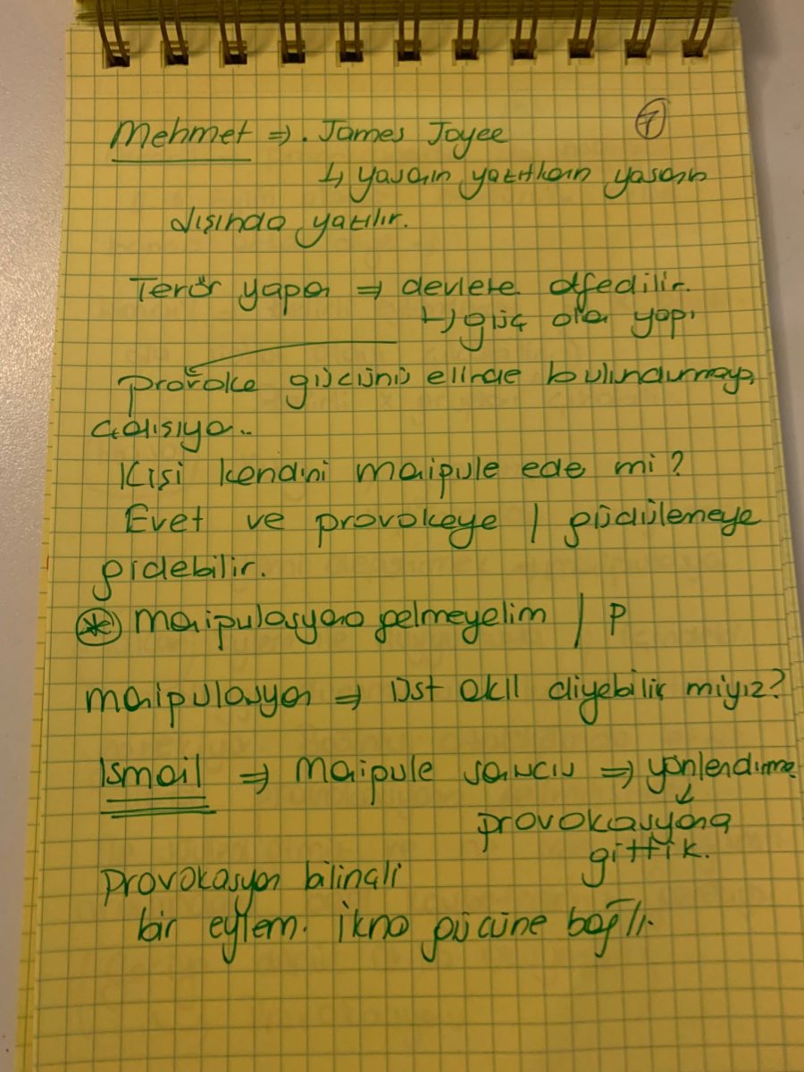 Mehmet: James Joyce, yasaları yazanların yasanın dışında yazdığını hatırlatır. Devletler güçlü olan taraf olan taraf olduklarını hatırlatmak ve provokasyon gücünü elinde tutmaya devam etmek için yeri geldiğinde teröristleri bile affeder.