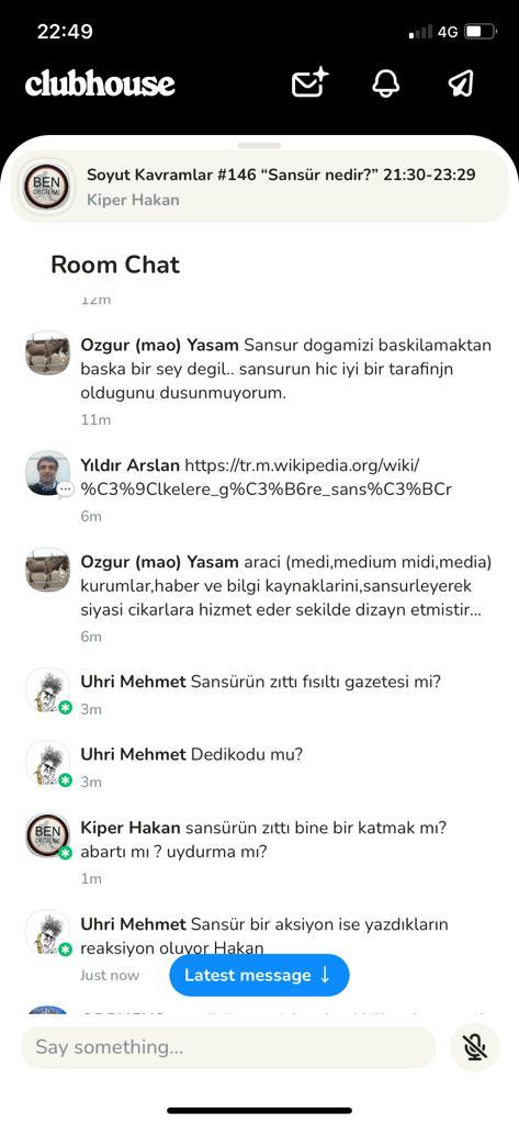 Özgür: Sansür; insanın toplumsal bilinci keşfetmişiyle farklı bilinçlere karşı takındığı tavır ve onu denetleme davranışıdır. Birey bilgiyi, olguyu sansürleyerek dışarı vuruyor. Sansür toplumda evrimleşiyor. Otoriteye saygıyla başlayan sansürün yolculuğu, ahlâkı temiz tutmak, örf âdetleri korumak, toplumu korumak, yanlış bilgiyi bastırmak gibi farklı şekillerde karşımıza çıkıyor. Yine de kimler tarafından uygulandığına bakmak gerek. Sansürün 2500 yıllık tarihine bakarsak sansürü kullananların fayda umarı içinde oldukları görülür. Bugün bu konuşmaları yaptığımız Clubhouse da bile ifadeye sansür uygulandığını görüyoruz.