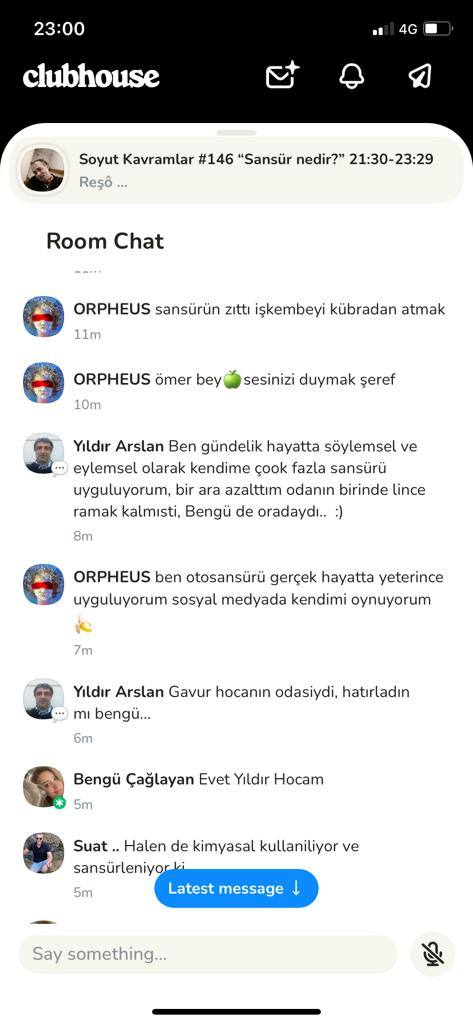 Özgür: Sansür; insanın toplumsal bilinci keşfetmişiyle farklı bilinçlere karşı takındığı tavır ve onu denetleme davranışıdır. Birey bilgiyi, olguyu sansürleyerek dışarı vuruyor. Sansür toplumda evrimleşiyor. Otoriteye saygıyla başlayan sansürün yolculuğu, ahlâkı temiz tutmak, örf âdetleri korumak, toplumu korumak, yanlış bilgiyi bastırmak gibi farklı şekillerde karşımıza çıkıyor. Yine de kimler tarafından uygulandığına bakmak gerek. Sansürün 2500 yıllık tarihine bakarsak sansürü kullananların fayda umarı içinde oldukları görülür. Bugün bu konuşmaları yaptığımız Clubhouse da bile ifadeye sansür uygulandığını görüyoruz.