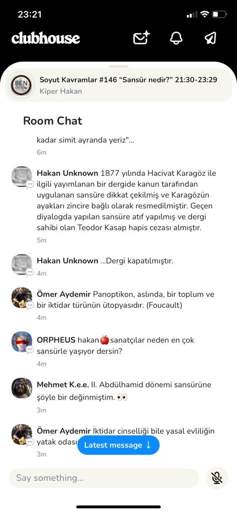 Özgür: Sansür; insanın toplumsal bilinci keşfetmişiyle farklı bilinçlere karşı takındığı tavır ve onu denetleme davranışıdır. Birey bilgiyi, olguyu sansürleyerek dışarı vuruyor. Sansür toplumda evrimleşiyor. Otoriteye saygıyla başlayan sansürün yolculuğu, ahlâkı temiz tutmak, örf âdetleri korumak, toplumu korumak, yanlış bilgiyi bastırmak gibi farklı şekillerde karşımıza çıkıyor. Yine de kimler tarafından uygulandığına bakmak gerek. Sansürün 2500 yıllık tarihine bakarsak sansürü kullananların fayda umarı içinde oldukları görülür. Bugün bu konuşmaları yaptığımız Clubhouse da bile ifadeye sansür uygulandığını görüyoruz.