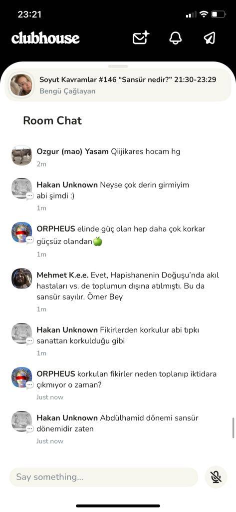 Özgür: Sansür; insanın toplumsal bilinci keşfetmişiyle farklı bilinçlere karşı takındığı tavır ve onu denetleme davranışıdır. Birey bilgiyi, olguyu sansürleyerek dışarı vuruyor. Sansür toplumda evrimleşiyor. Otoriteye saygıyla başlayan sansürün yolculuğu, ahlâkı temiz tutmak, örf âdetleri korumak, toplumu korumak, yanlış bilgiyi bastırmak gibi farklı şekillerde karşımıza çıkıyor. Yine de kimler tarafından uygulandığına bakmak gerek. Sansürün 2500 yıllık tarihine bakarsak sansürü kullananların fayda umarı içinde oldukları görülür. Bugün bu konuşmaları yaptığımız Clubhouse da bile ifadeye sansür uygulandığını görüyoruz.