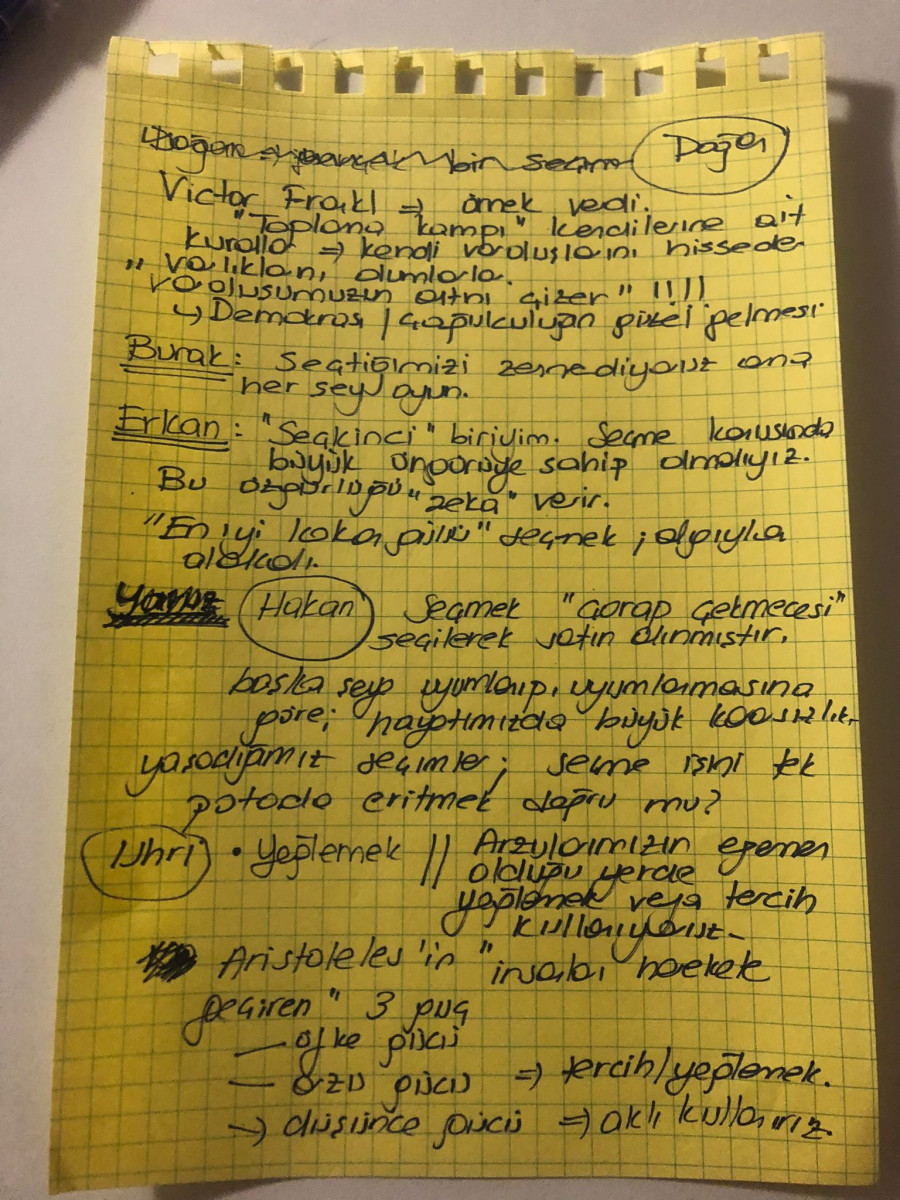 Uhri: Arzularımızın egemen olduğu yerde yeğlemek veya tercih etmek fiillerini kullanıyoruz. Aristoteles’in insanları harekete geçiren 3 gücü; öfke gücü, arzu gücü (yeğlemek/tercih), düşünce gücü (aklı kullanırız).