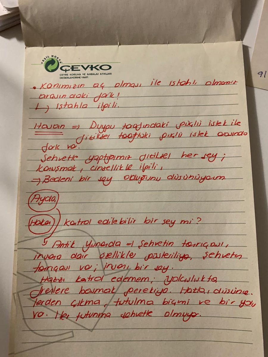 Hasan: Duygu tarafındaki güçlü istek ile fiziksel taraftaki güçlü istek arasında fark var. Şehvetle yaptığımız genelde fiziksel olan tarafta duruyor gibi görünüyor. Konuşmak, cinsellik vs. Bedeni bir şey olduğunu düşünüyorum.
