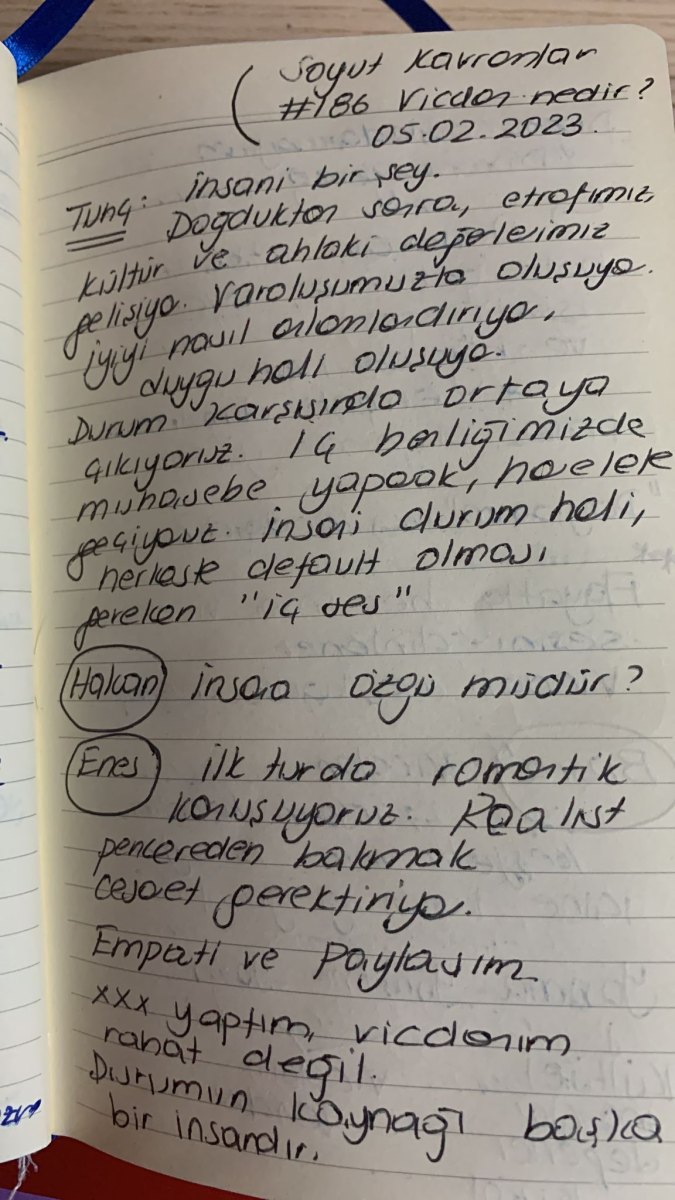 Kiper: Bizim “Soyut Kavramlar Oturumlarının” ilk yirmi üçünün notlarının olmadığını ve ve odalarda konuşulan kavramları tekrar konuştuğumuzu biliyorsunuz. Vicdan da yola çıktığımızda ilk uğradığımız duraklardan biri olmuştu. Bugün vicdanı tekrar konuşmak istiyoruz.