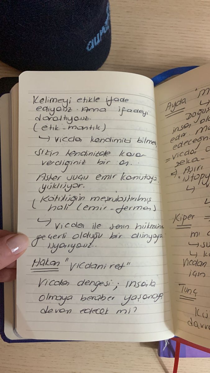Hasan: Vicdan bizi insan kılan ve/ya bizim insan kalmamızı sağlayan değerler sistemimizle oluşturduğumuz referans noktalarımızdır. Bu değerler sistemimizle oluşturduğumuz referans noktalarındaki sapmalara göre komut almaya başlıyoruz. İlişki kurduğumuz tüm ötekilerle ve kendi içimizle bu referans sistemindeki bütünlük içinde doğru ve yanlış olarak belirlediğimiz listemize uygun davranışlarla aslında biz oluyoruz veya diğer canlılardan ayrılabiliyoruz çünkü bir erdem yaratmaya çalışıyoruz, insan kendisine böyle bir rol biçiyor.