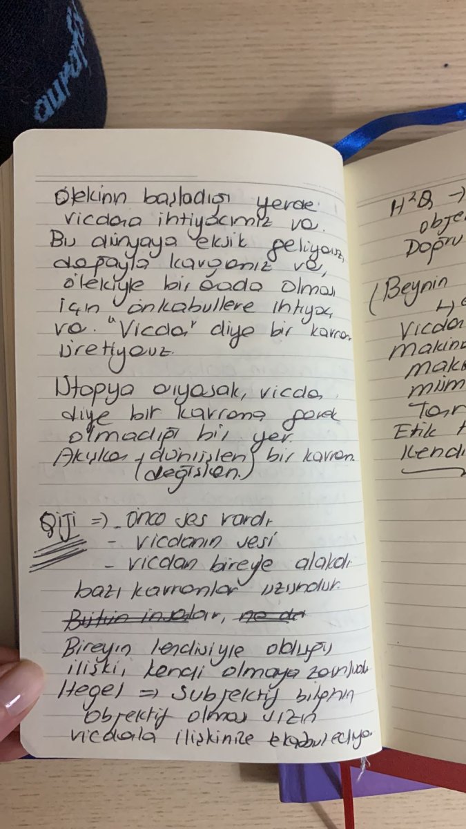 Kendimde kendime dair de bir vicdan algım var. Heidegger’ın vicdan çağrısı aklıma geliyor.  Bu çağrıda insanın kendi olmaya ihanet ettiği, ötekiler için kendi olmaktan vazgeçtiği zamanlarda bir vicdan çağrısı duyduğundan bahsediyor. Önceliğin otantiklik olduğunu söylüyor. Nietzsche’de başka bir perspektiften ancak vicdanı susturabildiğimiz zaman kendimiz olabileceğimizi söylüyor. O mahkeme sahnesinde içimizde bir ses var. Bu ses kime ait? İçimizdeki ötekiye dair vicdanı önemli buluyorum. Tabii, vicdanla kimin diliyle konuştuğum da önemli, kendi dilimle mi konuşuyorum yoksa ötekinin ve kendimin tabii olduğu toplumun yasalarının dili ile mi konuşuyorum?