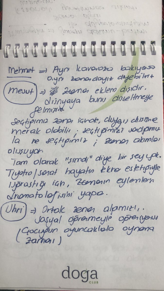 Mesut: Zaman eklem dışıdır. Dünyaya bunu düzeltmeye gelmişim. Seçtiğimiz zaman içinde, duygu düşünce merak olabilir. Seçtiğimizi sandığımızla ne seçtiğimizin arasındaki fark, zaman akımları oluşuyor. Tam olarak şimdi diye bir şey yok. Tiyatro/sanat hayatın ‘tekrar’ estetiğiyle uğraştığı için, zamanın eylemlerin dramaturgisini yapar.