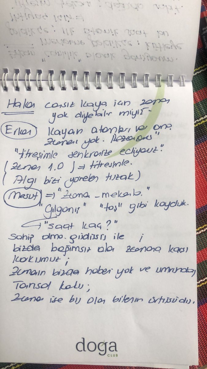 Murat: Işık dalgalanmasa zaman da durur. Ölçüm olmazsa zaman da yok. Nesnelerin hareketi, değişiminde zaman mefhumu yok. Atan saatlerinde zamanı ölçüyoruz; 9 milyar titreşim 1 saniyeye denk geliyor. Kütle zamanı yavaşlatıyor. Bir nano saniyede boşluk olursa algılayamayız.