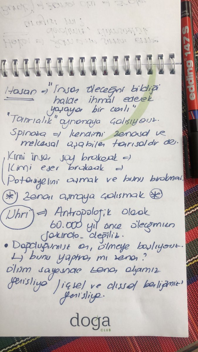 Hasan: İoanna Kuçuradi, İnsan öleceğini bildiği halde bunu ihmal ederek yaşayan bir canlıdır, der. Tanrıcılık oynamaya çalışıyoruz. Spinoza, kendini zamansal ve mekânsal olarak aşabilen tanrısaldır der. Kimi insan soy bırakarak, kimi eser bırakarak bunu yapmaya çalışmıyor mu? Potansiyelini aşmak ve bunu bırakmak. İnsan zamanı aşmaya çalışıyor…