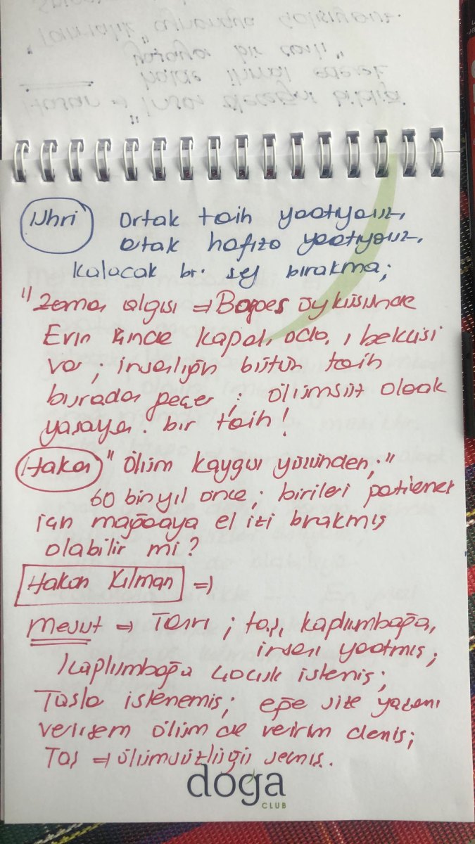 Uhri: Antropolojik olarak 60.000 yıl önce öleceğimizin farkında değiliz. Doğduğumuz an, ölmeye başlıyoruz. Bunu yaptıran zaman mı? Ölüm sayesinde zaman algımız genişliyor. İçsel ve dışsal benliğimiz genişliyor. Bu genişlemeyle ortak tarih yaratıyoruz. Ortak hafıza yaratıyoruz. Kalacak bir şey bırakmaya çalışıyoruz. Zaman algısı, Borges’in öyküsünde evin içinde kapalı bir oda var, bu odanın da bir bekçisi var. İnsanlığın bütün tarih derdi buradan geçer. Ölümsüz olacak yaşayan bir tarih.
