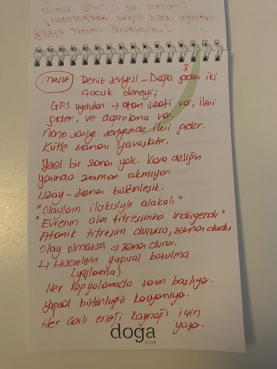 Mesut: Deniz seviyesi, dağa giden iki çocuk deneyi. GPS uyduları, atan saati var, ileri gider ve doğrulama var. Nano saniye seviyesinde ileri gider. Kütle zamanı yavaşlatır. Yerel bir zaman yok. Kara deliğin yanında zaman akmıyor. Uzay, zaman bütünleştik.